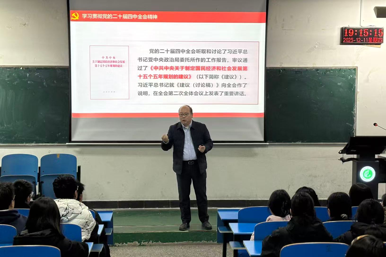 为引导广大师生深刻领会党的二十届四中全会核心要义与实践要求,自觉将思想和行动统一到“十五五”时期国家发展大局和战略部署上来,12月11日晚,副校长代克杰在2306教室为数学与统计学院2025级全体学生作党的二十届四中全会精神专题宣讲报告。宣讲会由学院党委书记张建林主持。