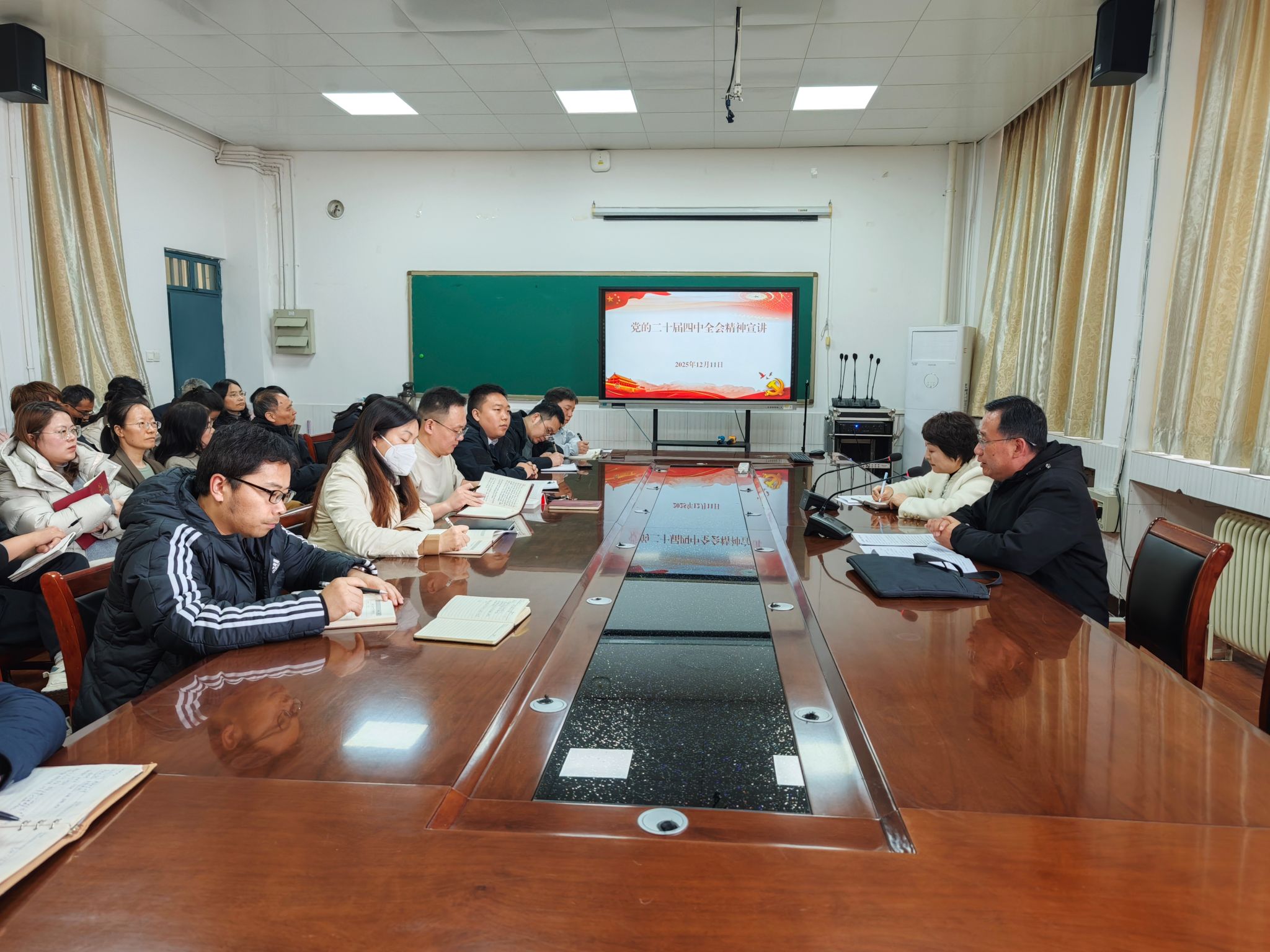 12月11日下午,党委副书记侯延民在3314会议室向电气与机械工程学院全体教职工开展党的二十届四中全会精神专题宣讲。宣讲会由电气与机械工程学院党委书记张琳主持。