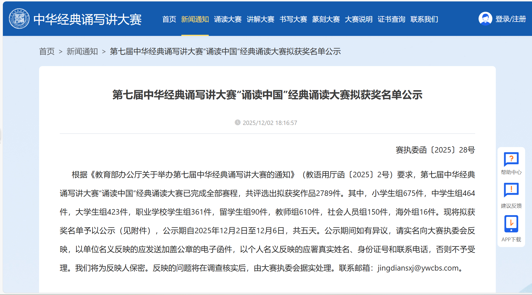 此次获奖是新闻与传播学院“以文化人、以声传情”育人理念的生动实践。学院始终坚持以专业赛事为牵引,将经典诵读融入课程教学与专业实训,构建“课堂+实践+竞赛”三维一体的育人模式,强化学生语言表达能力、审美素养与文化传播力的综合培养。未来,学院将继续深化“以赛促教、以赛促学”机制,依托专业优势,推动中华经典文化教育与实践深度融合,为培养具有人文底蕴、专业能力与社会担当的卓越传播人才不懈努力。