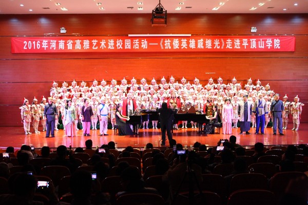 11月21日晚,由河南省教育厅、文化厅、财政厅主办的“2016年河南省高雅艺术进校园活动”平顶山学院专场演出在中心会议室举行,演出剧目是由河南理工大学音乐学院师生带来的交响清唱剧——《抗倭英雄戚继光》。河南理工大学工会主席解伟、平顶山学院党委副书记袁桂娥、田建伟和近500名师生观看了演出。