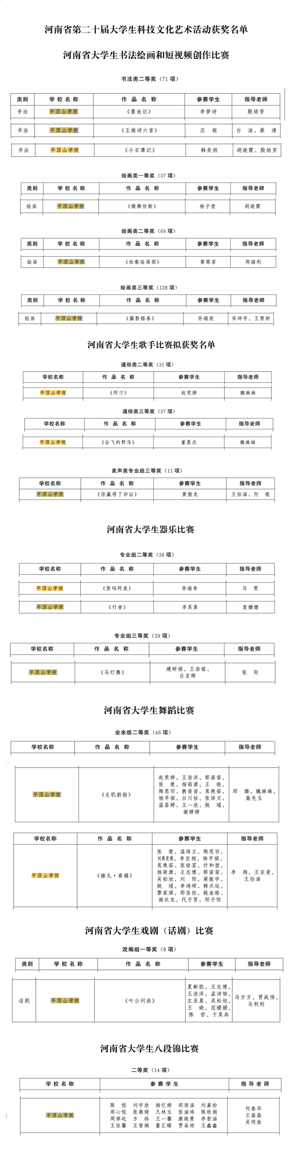 艺术设计学院杨子莹同学的作品《蝶舞祁新》荣获大学生书法绘画和短视频创作比赛绘画类一等奖;音乐学院夏彬凯、王志博、王浩洋、孟诗焓、左亚晨、吴松旭等10名同学的作品《叶公问政》,获大学生戏剧(话剧)比赛改编组一等奖。