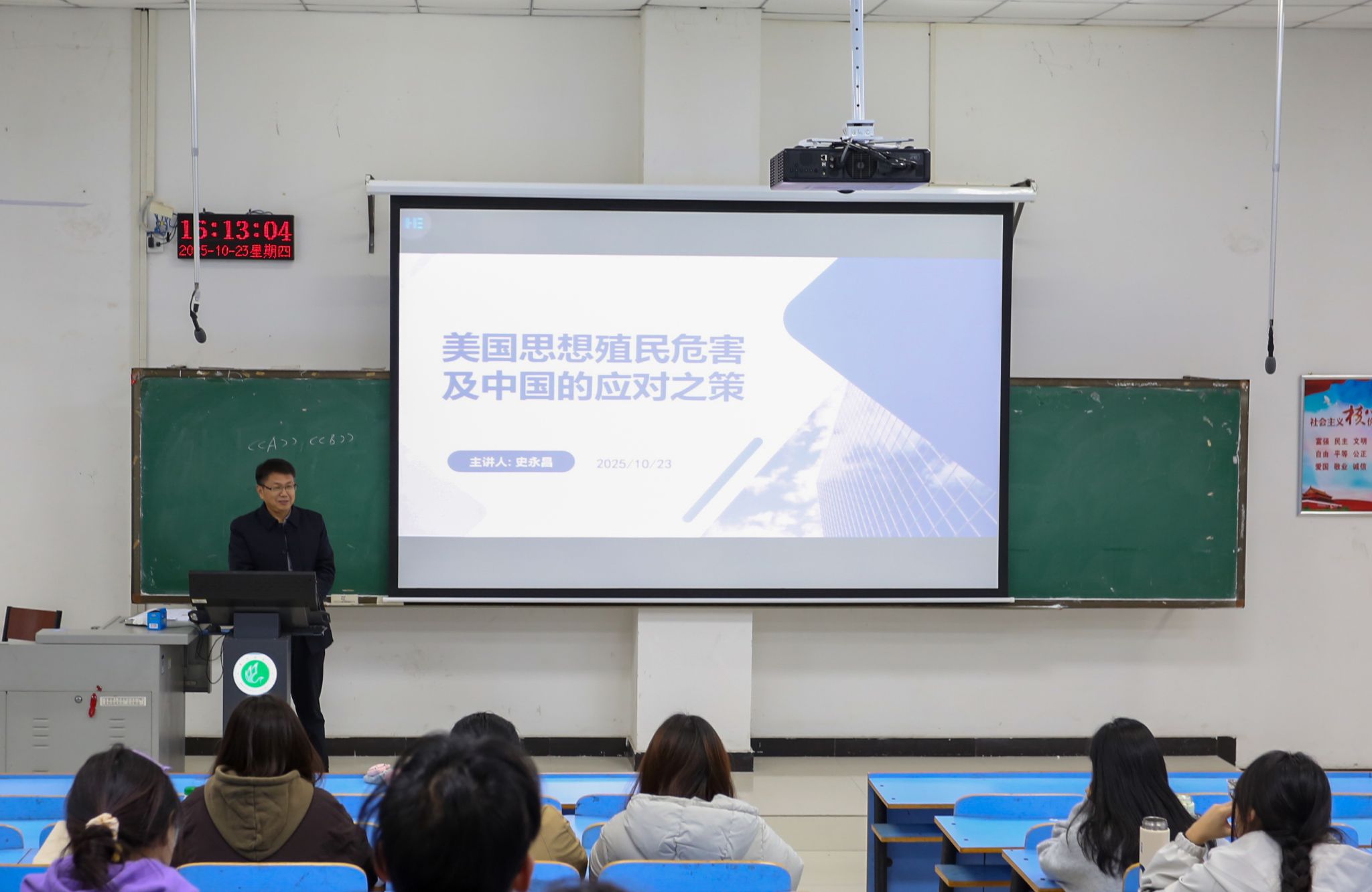 10月23日下午,“追梦·领航”思政课在图书馆208教室准时开讲。副校长史永昌以《美国思想殖民危害及中国的应对之策》为题,为现场学生带来了一堂理论扎实、视野开阔的专题思政课。