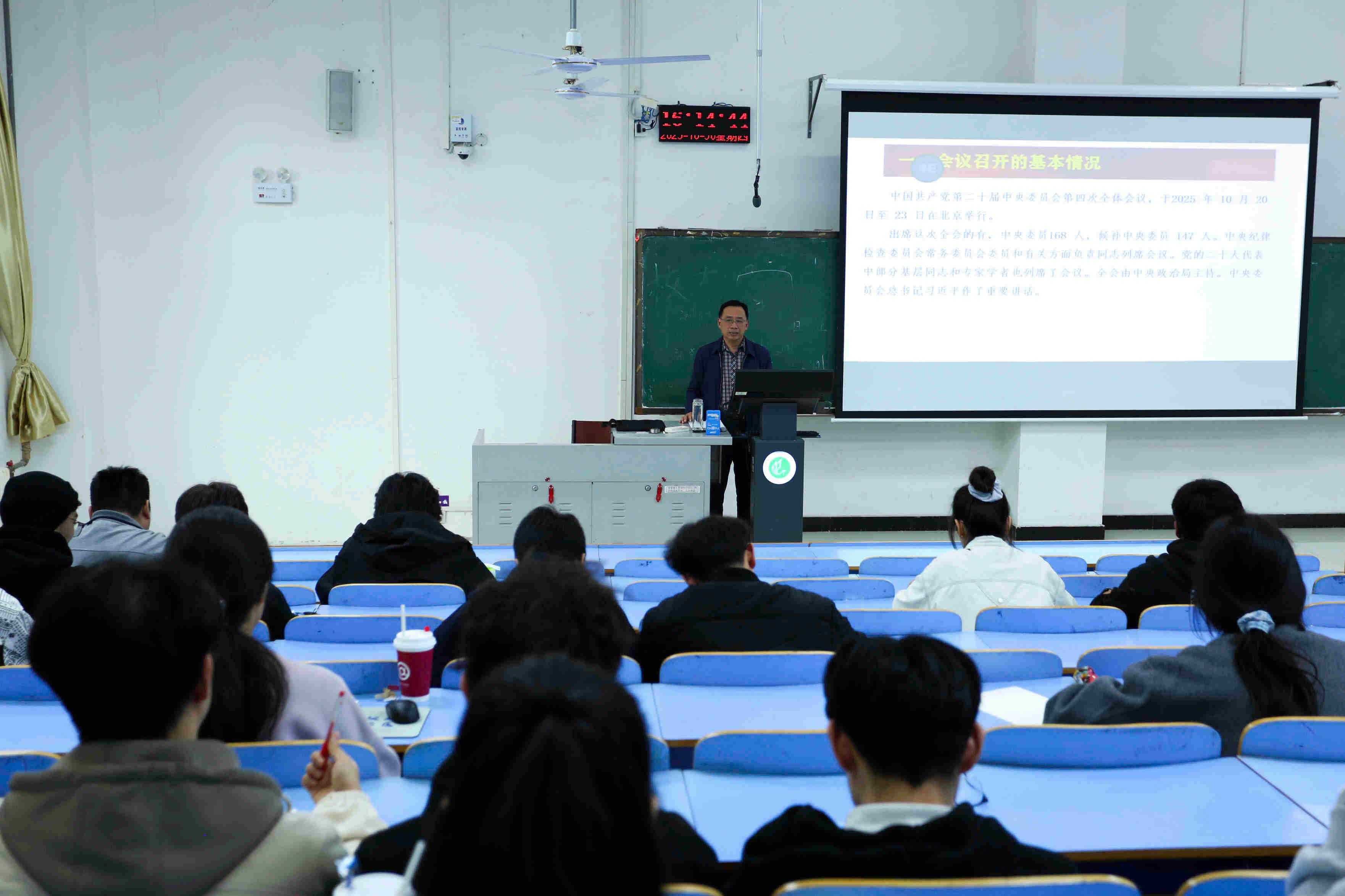 侯延民从党的二十届四中全会召开背景与基本情况出发,系统梳理了我国在“十四五”期间取得的重大发展成就,包括经济总量稳步增长、对世界经济增长贡献率持续攀升,全球创新指数显著提升,可再生能源体系加速构建,以及教育、社保、医疗等社会事业全面进步。在此基础上,他重点阐释了“十五五”时期必须坚持党的全面领导、人民至上、高质量发展等六大原则,深入解读“十四五”辉煌成就背后“两个确立”的决定性意义,揭示党中央在应对风险挑战中展现的历史主动与战略定力,引导学生进一步增强政治自觉,坚定在复杂局面中把握战略机遇、推动高质量发展的信心与决心。