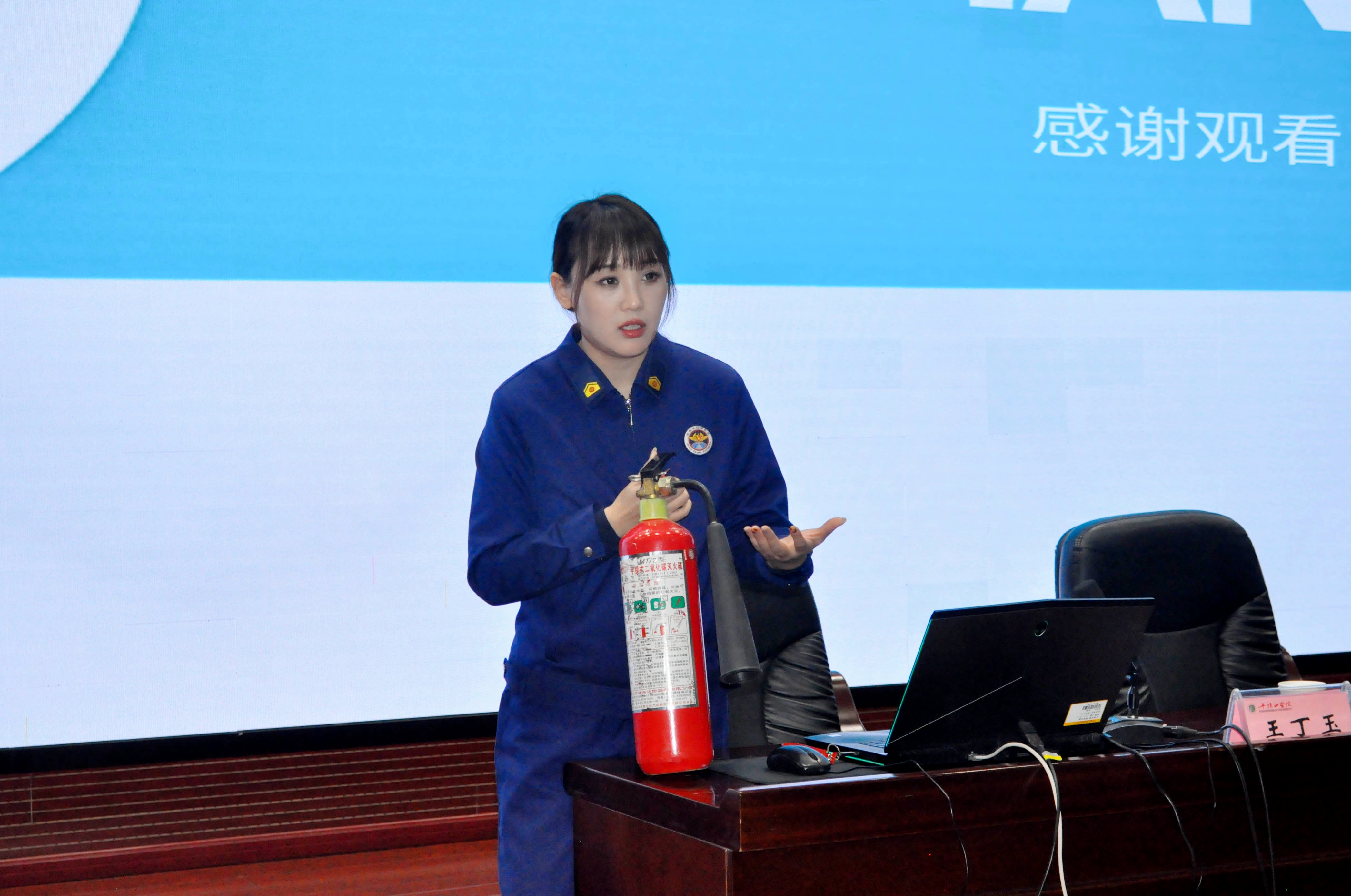 在实践环节,王丁玉现场示范了灭火器的正确使用方法,“提、拔、握、压”四字口诀配合实际操作,帮助师生们快速掌握初期火灾的扑救技巧。