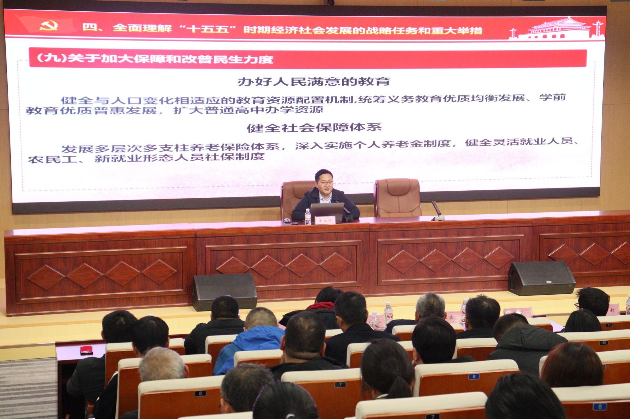 为深入学习贯彻党的二十届四中全会精神,感悟中国共产党人精神谱系的伟大力量,切实把思想和行动统一到党中央重大决策部署上来,12月11日,副校长米立伟在尧山实验室一楼会议报告厅开展“学习贯彻党的二十届四中全会精神”宣讲报告。化学与环境工程学院全体教师及学生代表200余人参加会议。报告会由学院党委书记曹萍主持。
