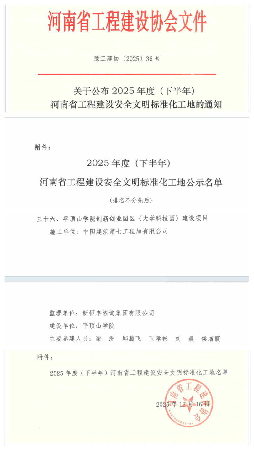 近日,从河南省工程建设协会获悉,平顶山学院创新创业园区(大学科技园)建设项目荣获“2025年度下半年河南省工程建设安全文明标准化工地”称号。此项荣誉是我省建筑行业在安全生产、文明施工领域的最高评价之一。
