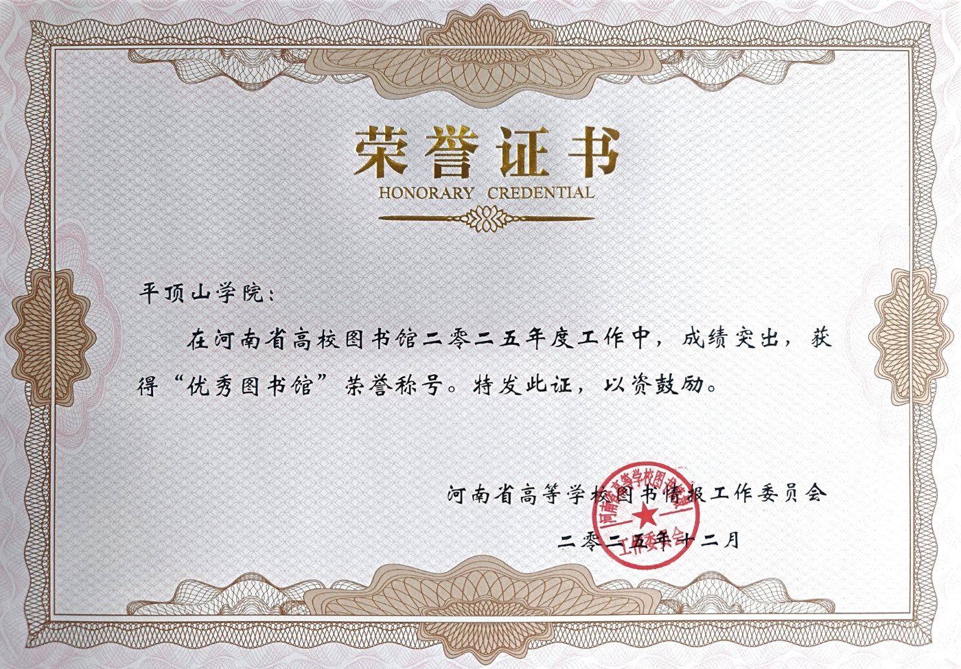 近日,在河南省高等学校图书情报工作委员会组织的河南省高校图书馆2025年度优秀图书馆、优秀图书馆员评选活动中,我校图书馆荣获“优秀图书馆”荣誉称号,孙薇、程舍、熊瑛、张莉、朱淑伟、韩聪6名馆员荣获“优秀图书馆员”荣誉称号。
