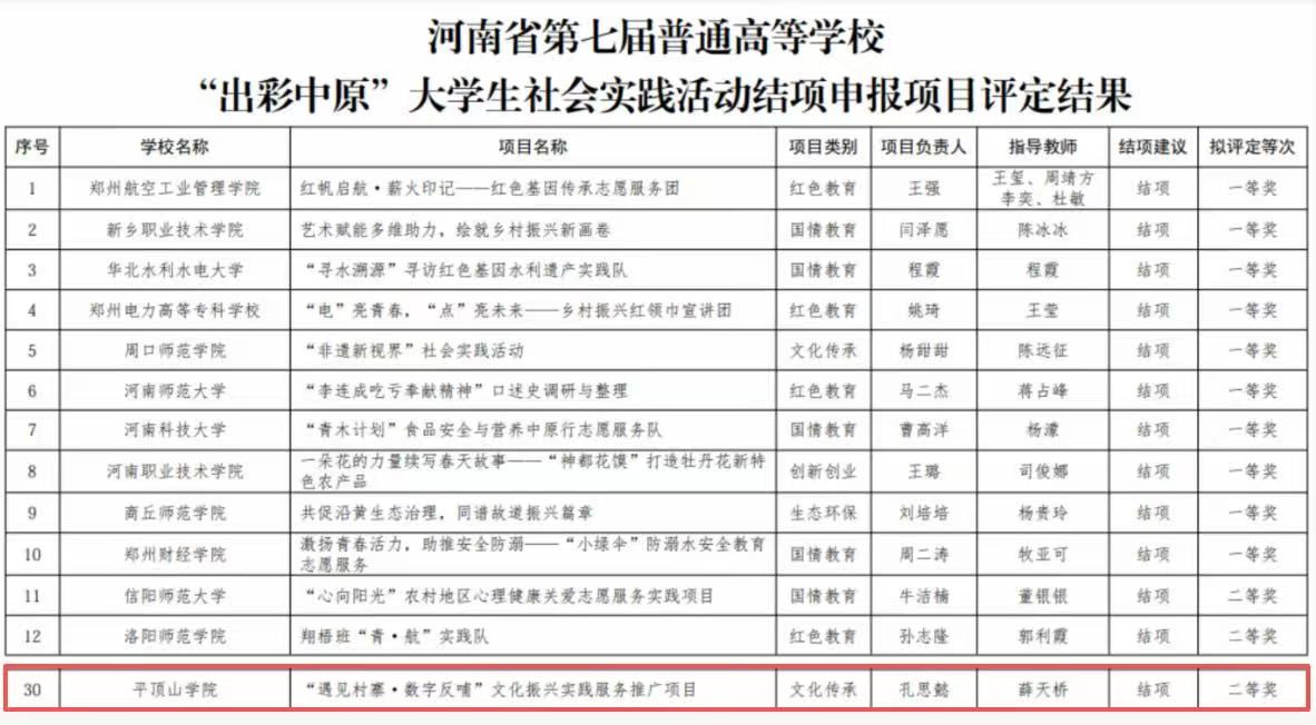 近日,河南省教育厅公布了《关于第九届普通高等学校“出彩中原”大学生社会实践活动项目立项和第七届普通高等学校“出彩中原”大学生社会实践活动结项评定结果的公示》通知,我校《“国韵捶丸,鹰承匠心”文化振兴实践推广项目》在第九届河南省“出彩中原”大学生社会实践活动中成功立项;《“遇见村寨·数字反哺”文化振兴实践服务推广项目》荣获第七届河南省“出彩中原”大学生社会实践活动结项评审二等奖。