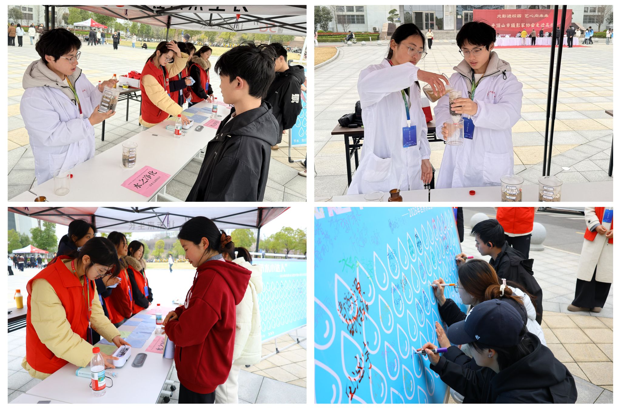 本次活动共设置三个宣传区域。在“水之科普”区,志愿者现场开展活性炭吸附与絮凝沉淀两项净水实验,直观展示水净化原理。在“水之呵护”区,志愿者使用净化水与专用清洁液为师生提供免费眼镜清洗服务,以实际行动传递志愿精神;同时设置科普展板,普及饮用水安全与日常节水知识,强调洁净水在个人健康与生活中的重要作用。在“水之承诺”区,设置承诺签名墙,师生纷纷书写节水承诺,以实际行动成为节水理念的践行者与传播者。