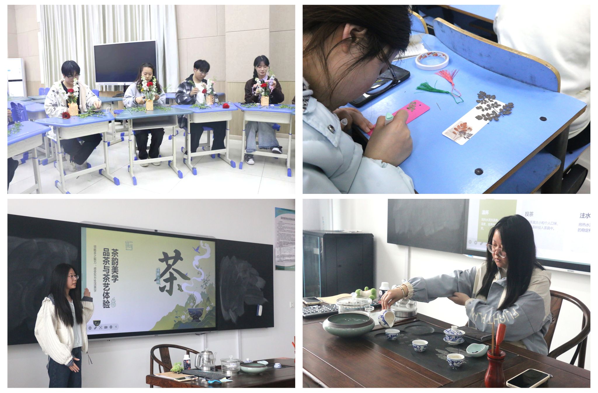花艺美学课堂带领学生认识常见花材与花语,学习插花造型与层次构图,并在现场实操中完成个人花艺作品。茶韵美学课堂通过六大茶类品鉴与传统茶艺演示,让同学们在温杯、投茶、分茶等环节中亲身体验茶器与茶汤的和谐之美,在一泡一品间感受东方生活美学的雅致韵味。