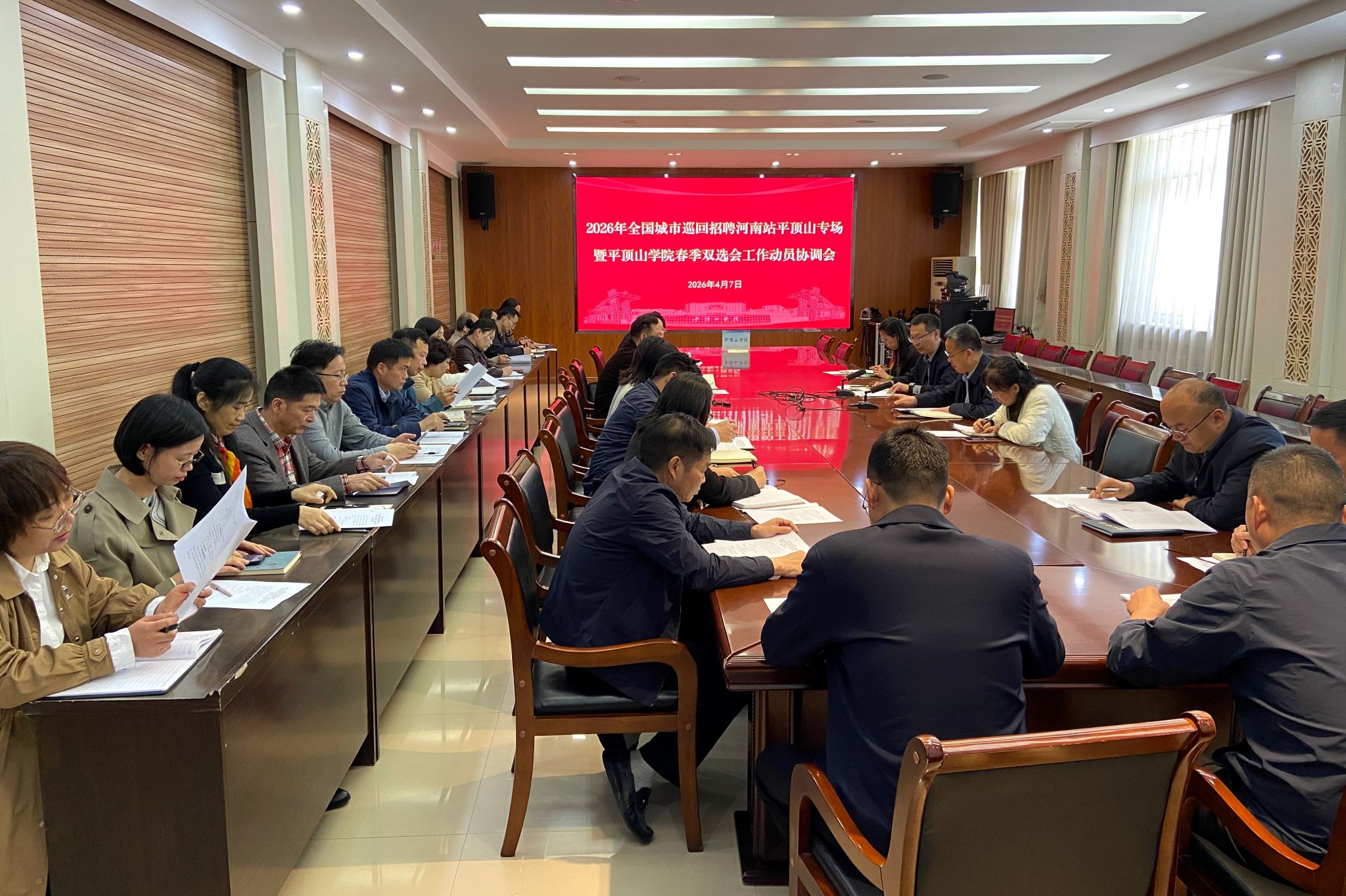 4月7日上午,我校在行政楼329会议室召开2026年全国城市巡回招聘河南站平顶山专场暨平顶山学院春季双选会工作动员协调会。院长办公室、党委宣传部、招生就业处、教务处、学生处等相关部门负责人及各学院主要负责人参加会议。
