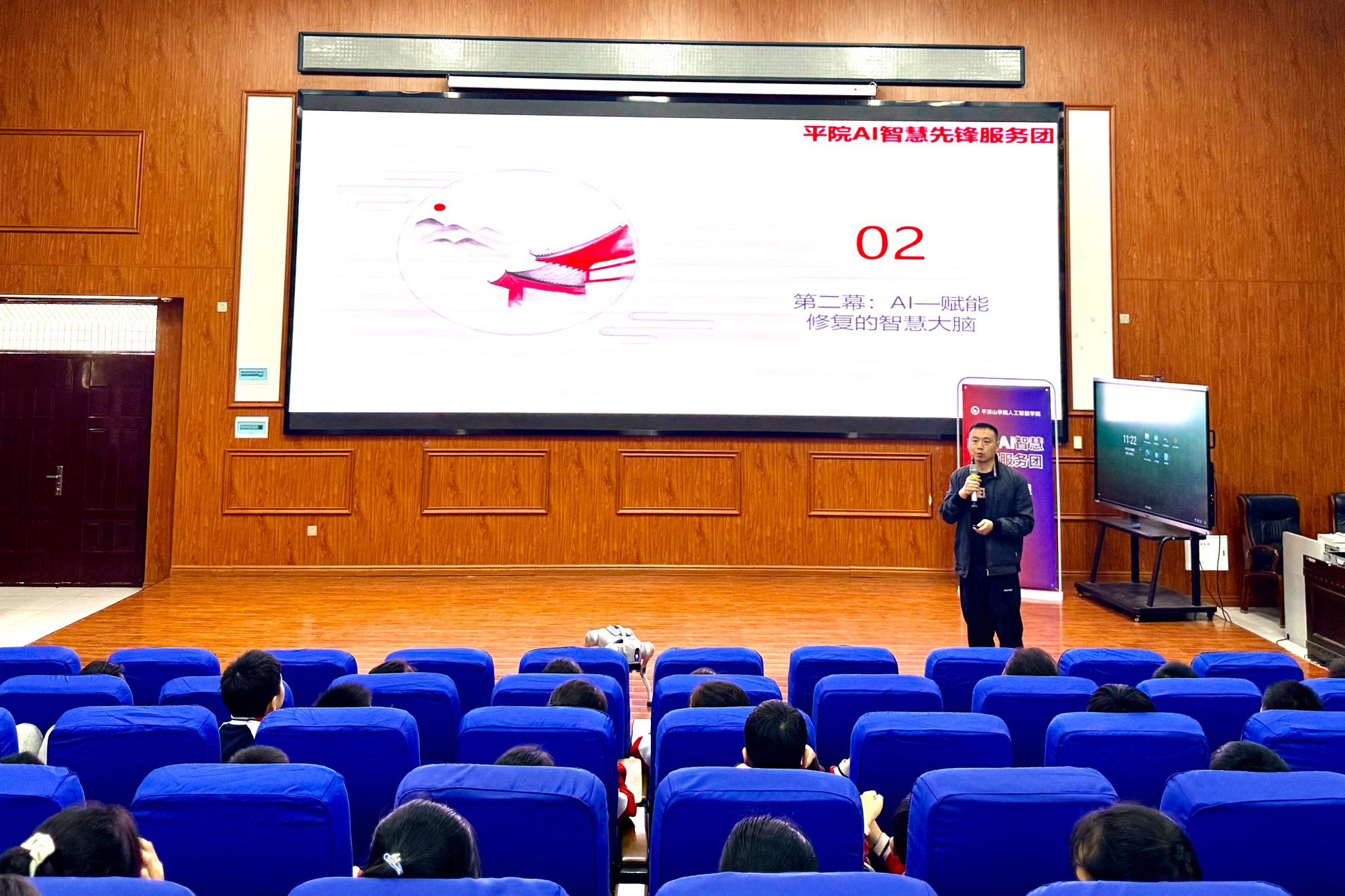 活动伊始,服务团学生志愿者赵紫瑞现场展示了AI机器狗的智能表演。通过生动有趣的互动形式,同学们近距离感受到了人工智能技术的实际应用与独特魅力,现场气氛热烈。在宣讲环节,吕琼帅围绕“人工智能与文化遗产保护”主题展开分享。他结合专业知识,系统讲解了AI技术在壁画修复中的应用原理与实践成果,深入浅出地带领同学们了解科技如何助力文化遗产守护。这一过程不仅普及了前沿科技知识,更激发了同学们对人工智能技术的探索兴趣以及对文化遗产保护的责任意识。
