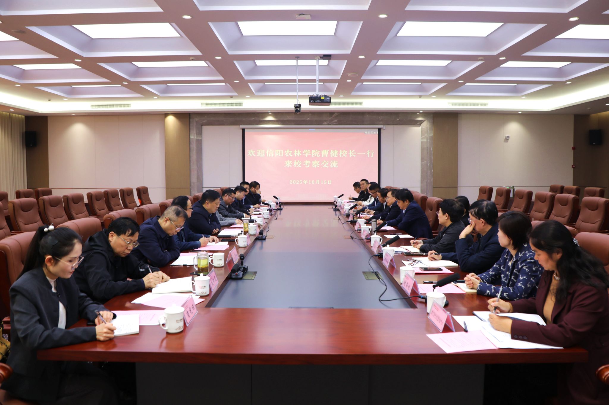10月15日下午,信阳农林学院校长曹健、副校长易军鹏、张光辉、雷振山等一行十余人来我校考察交流。座谈会在尧山实验室二楼会议室举行,校长郭秋平出席活动,校长办公室、发展规划处、人事处、教务处、科研处等相关部门负责人参加活动。会议由副校长李波主持。
