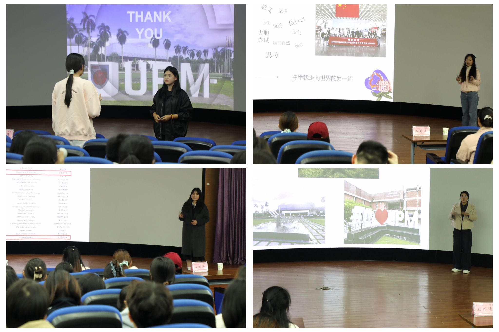 分享环节,赴澳大利亚交流学习的刘晨夕、韩宇菲分别从海外交流项目选拔的经验技巧和研修期间的能力提升感悟进行了细致讲解;赴马来西亚博特拉大学交流学习的周静怡与吴怡,围绕当地学习环境、课程设置特色及跨文化交际中的收获展开了分享。