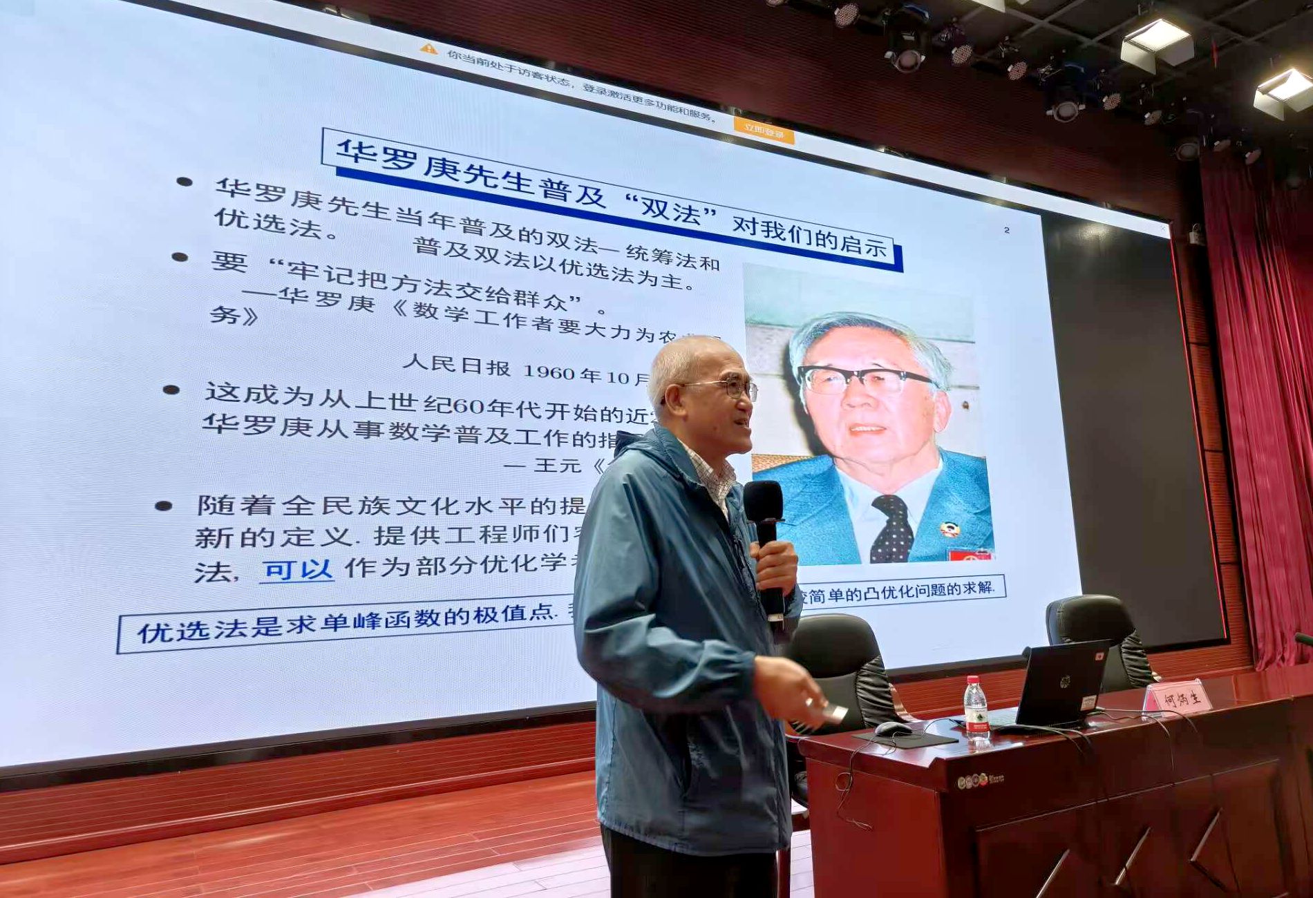 报告会上,何炳生教授以《用普通的大学数学做出国际同行高度认可的优化方法》为题,从华罗庚的牢记“把方法交给群众”的思想谈起,指出科学与工程计算中出现的许多优化问题都可以归结为一个变分不等式,并用“瞎子爬山判别是否到达顶点”生动形象地刻画了变分不等式的数学内涵。报告讲述了如何利用普通的大学数学和一般的优化原理,以变分不等式为工具,做出一些被国际同行知名学者誉为“Very Simple yet Powerful”和“Elegant”的研究工作。