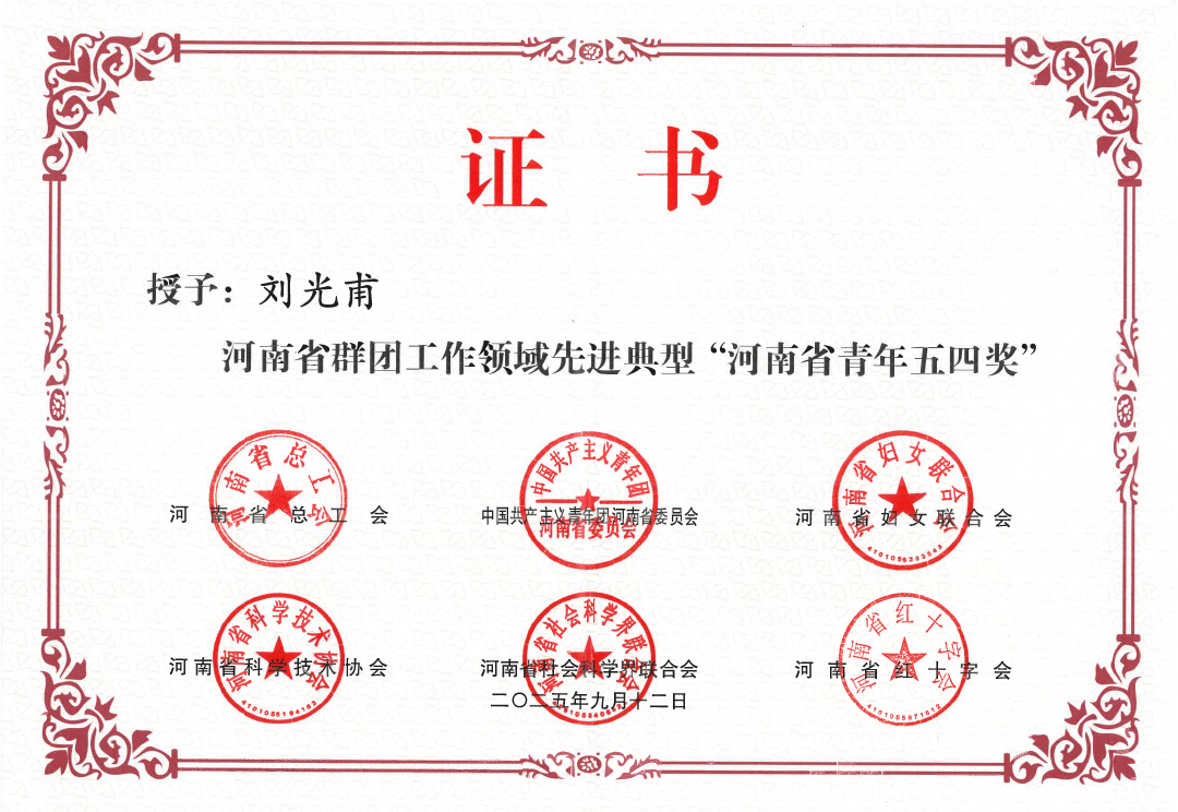 近日,我校陶瓷学院刘光甫博士荣获由河南省总工会、共青团河南省委、河南省妇女联合会、河南省科学技术协会、河南省社会科学界联合会、河南省红十字会等六家省级单位联合授予的“河南省青年五四奖”,这一荣誉是对其在我校陶瓷专业教育、科学研究、艺术创作与行业发展中的高度肯定。