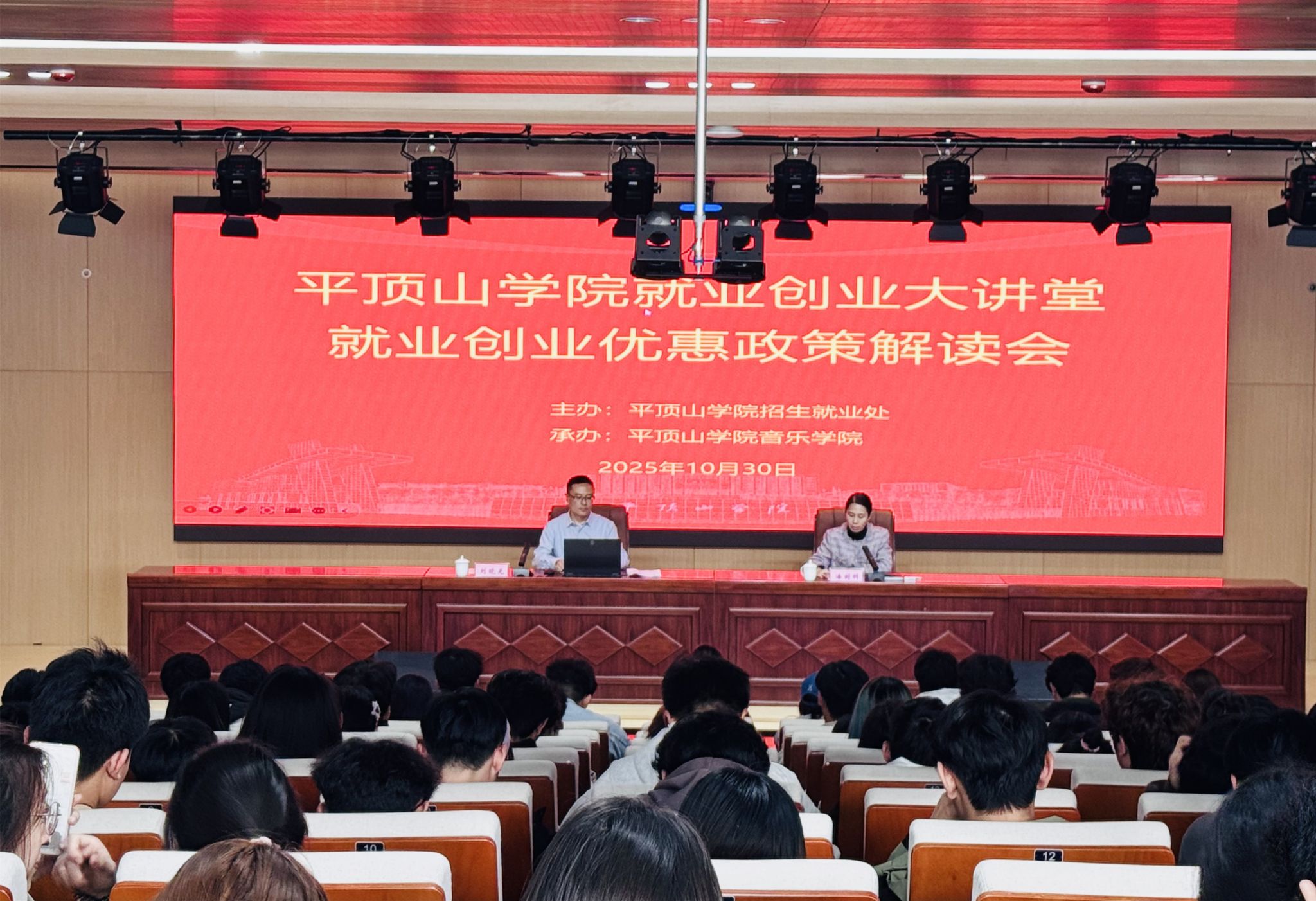为进一步构建我校毕业生高质量就业服务体系,营造浓厚的就业育人氛围,帮助学生树立生涯规划意识、转变就业观念,提升就业能力,促进我校大学生高质量充分就业。10月30日,我校在尧山实验室一楼会议报告厅举办“就业创业大讲堂”——就业创业优惠政策解读会。本次活动由招生就业处主办,音乐学院承办,邀请平顶山市就业创业服务中心副主任刘晓光主讲,全校各二级学院师生代表300余人参加。会议由音乐学院党委书记潘刻科主持。