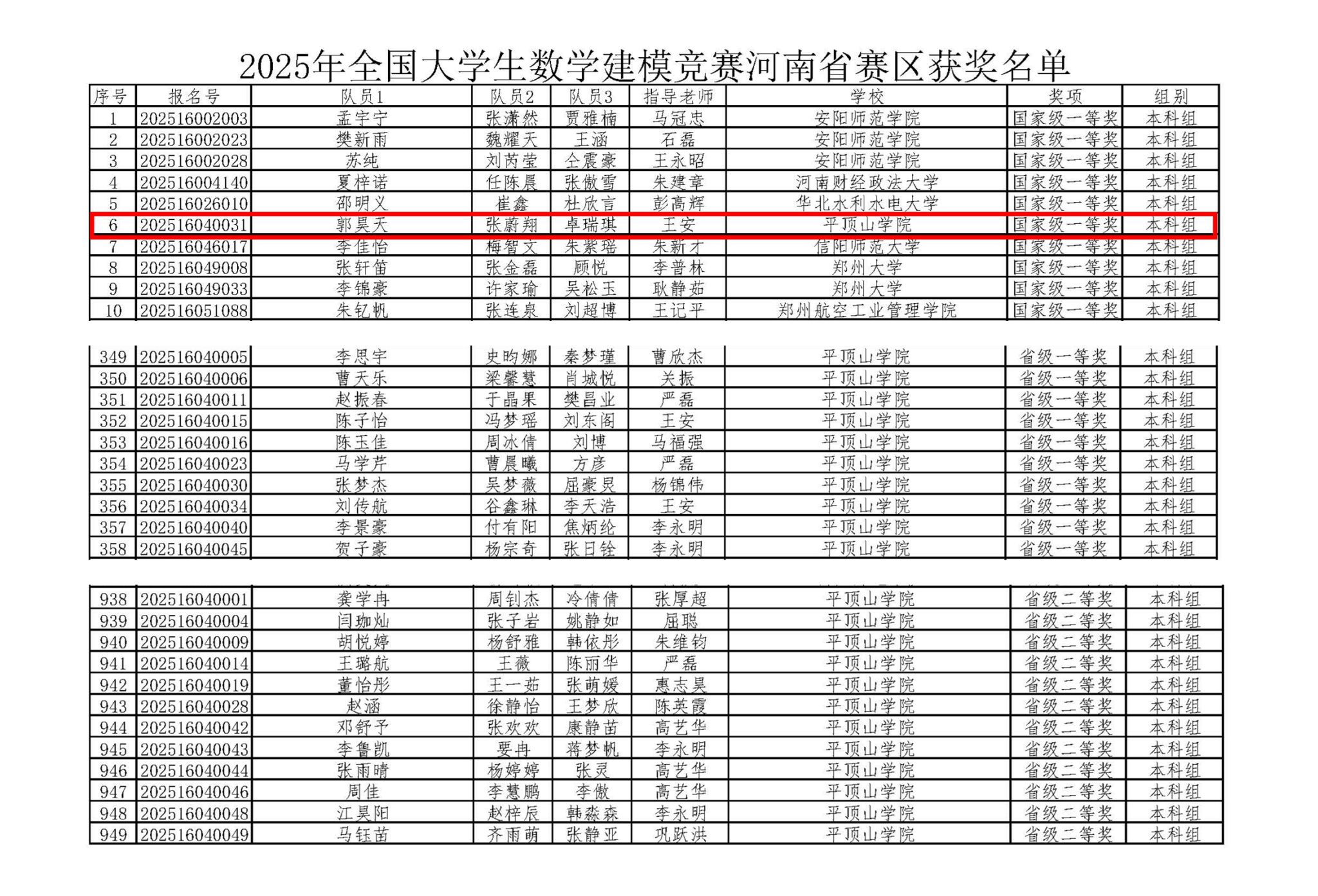 近日,2025年全国大学生数学建模竞赛结果公布,由数学与统计学院王安老师指导的郭昊天、张蔚翔、卓瑞琪团队获得国家一等奖(获奖率0.48%),取得了我校在该项赛事获奖的历史性突破;我校也成为获得该奖项的河南省7所高校之一。