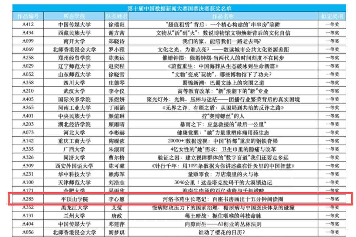 在本次大赛中,由我校新闻与传播学院网络与新媒体专业李心愿等同学创作、万鹏老师指导的作品《河洛书苑生长笔记:百座书房画出十五分钟阅读圈》,在省赛中取得一等奖后再续辉煌,与国赛中300支队伍同场竞技,再度荣获国赛一等奖,取得双连冠的佳绩,万鹏老师获得优秀指导教师奖。该作品以地方公共文化建设为切入点,聚焦于文化民生工程——“河洛书苑”城市书房,成功完成了一次数据新闻的全链路实践,全面地解读了“洛阳模式”,验证了数据新闻在解读公共政策方面的应用价值,受到了业界专家的一致好评。