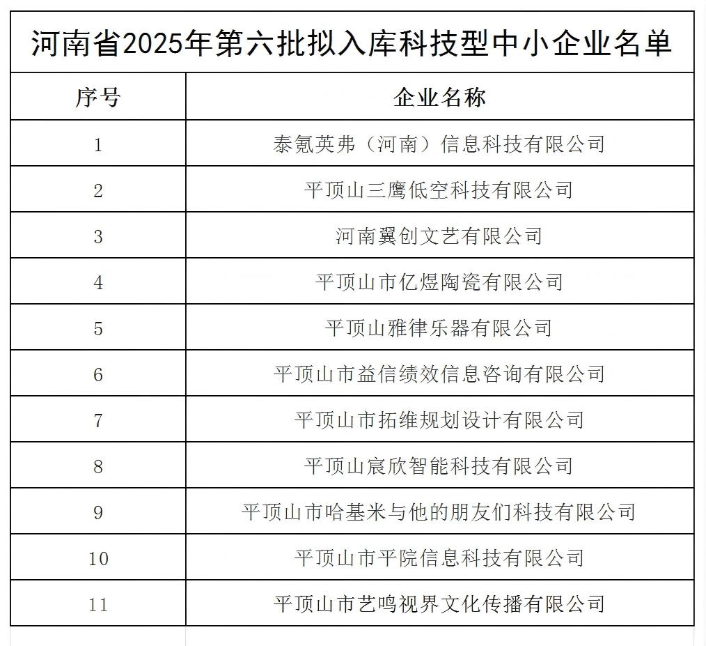 近日,河南省科技厅公布《河南省2025年第六批拟入库科技型中小企业名单》,平顶山学院鹰翔众创空间孵化培育的11家在孵企业成功入选,荣获国家“科技型中小企业”资质认定。这标志着学校在深化创新创业教育、项目化+导师制、服务地方产业升级等方面取得又一重要突破。