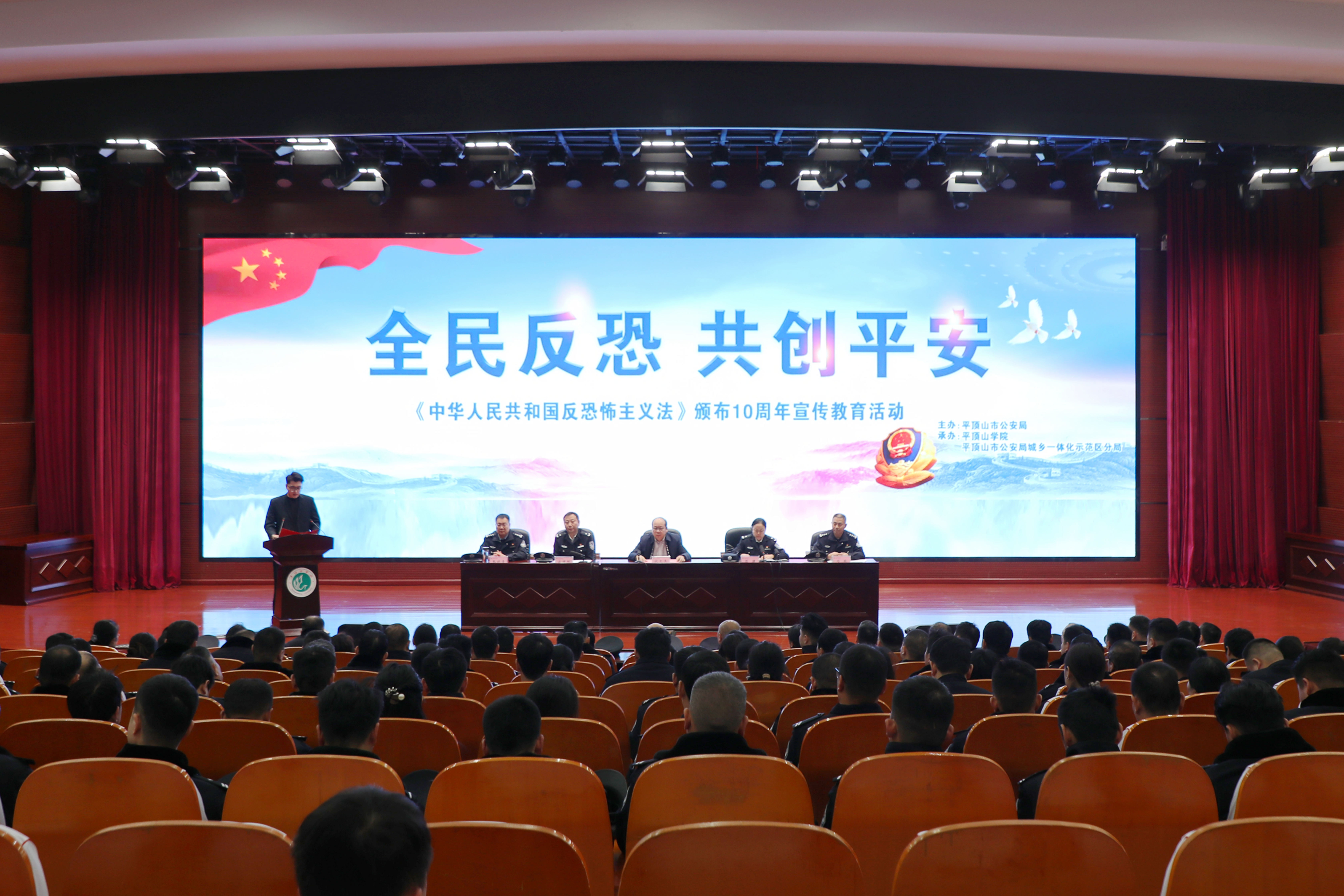 12月26日上午,平顶山市“全民反恐 共创平安”《中华人民共和国反恐怖主义法》颁布10周年宣传教育活动启动仪式在我校湖滨校区中心会议室举行。平顶山学院副校长代克杰,平顶山市公安局党委委员宗健刚,市公安局政治安全保卫支队、刑事侦查支队、网络安全保卫支队主要负责同志及各区公安分局主管领导出席启动仪式,我校师生代表及民警代表近400人参加了启动仪式。仪式由平顶山市公安局党委委员陈婕主持。