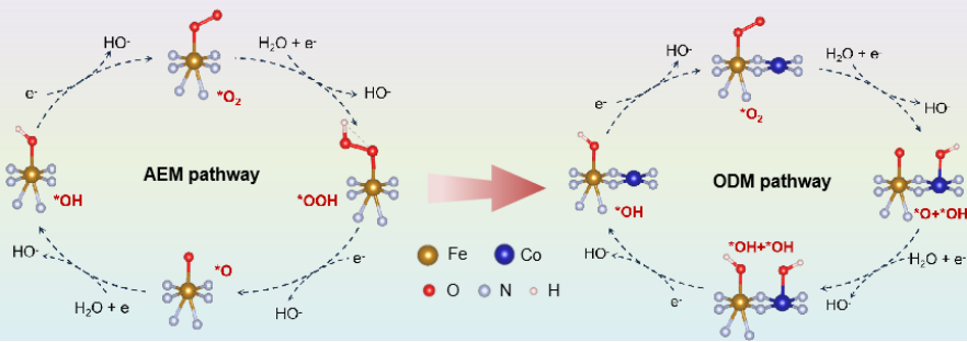 目前,单位点分散的过渡金属氮碳催化剂原子利用率高,活性位点明确,但催化活性中心单一,缺乏相邻共催化位点,遵循典型的吸附演化机制(AEM:Adsorption Evolution Mechanism,O2 →*OOH →*O →*OH,下图左),是制约氧还原反应(ORR)本征动力学突破与否的关键瓶颈。研究发现双位点催化剂在ORR过程中倾向发生动态配位重构,M1-M2双核协同活化O2分子,形成*O-O*桥连的*M1-O-O-M2*活性中间体,降低*OOH过渡态生成速率,抑制AEM反应路径。然而,传统的双金属位点反应体系只是缩小了*OOH与*OH的吸附能次优差值,二者之间的线性吸附标度关系依然存在。本研究通过配位结构的理性设计重构氧还原基元反应路径,实现电催化氧解离机制(Oxygen Dissociation Mechanism, ODM),即O2 →O* + OH*→2 HO*→OH*(下图右),提升本征反应动力学,提供高效原子级催化剂设计的基础性见解。