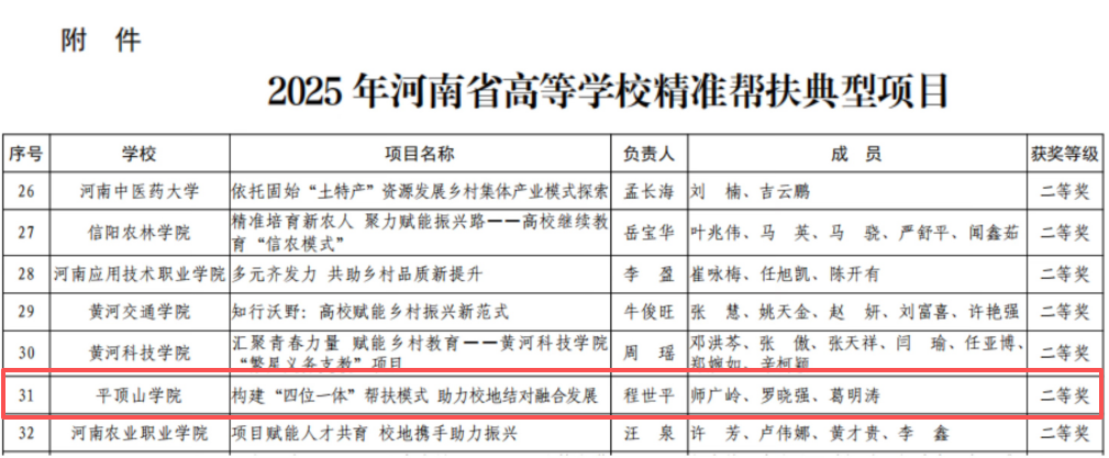 近日,河南省教育厅发布《关于公布2025年河南省高等学校精准帮扶典型项目推选结果的通知》(教办发规〔2025〕315号),我校推荐的《构建“四位一体”帮扶模式 助力校地结对融合发展》精准帮扶典型项目成功入选并荣获二等奖。