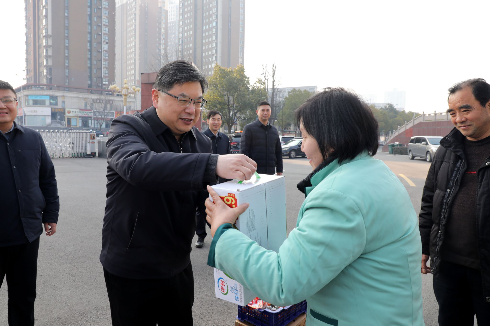 校领导为崇文校区值守人员送上慰问品(摄影/王卓菲)