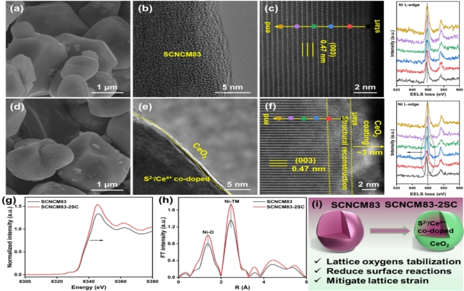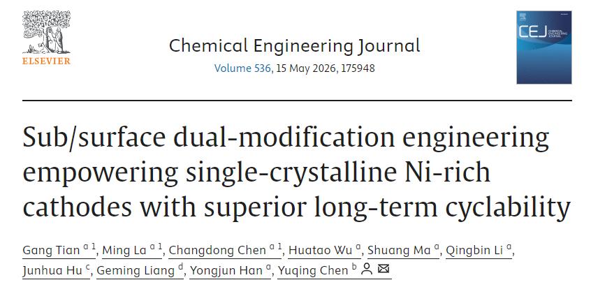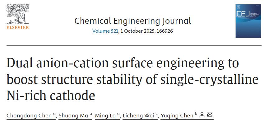 近日,我校材料科学与工程学院纳米能源材料研究团队联合澳大利亚阿德莱德大学同步辐射光源中心(QS世界排名82位)、佛山仙湖实验室协同攻关,在国际权威期刊《Chemical Engineering Journal》连续发表两篇研究论文,题目分别为《Dual anion-cation surface engineering to boost structure stability of single-crystalline Ni-rich cathode》与《Sub/surface dual-modification engineering empowering single-crystalline Ni-rich cathodes with superior long-term cyclability》。陈昌东博士、田刚博士分别为两篇论文第一作者,平顶山学院为论文第一完成单位。