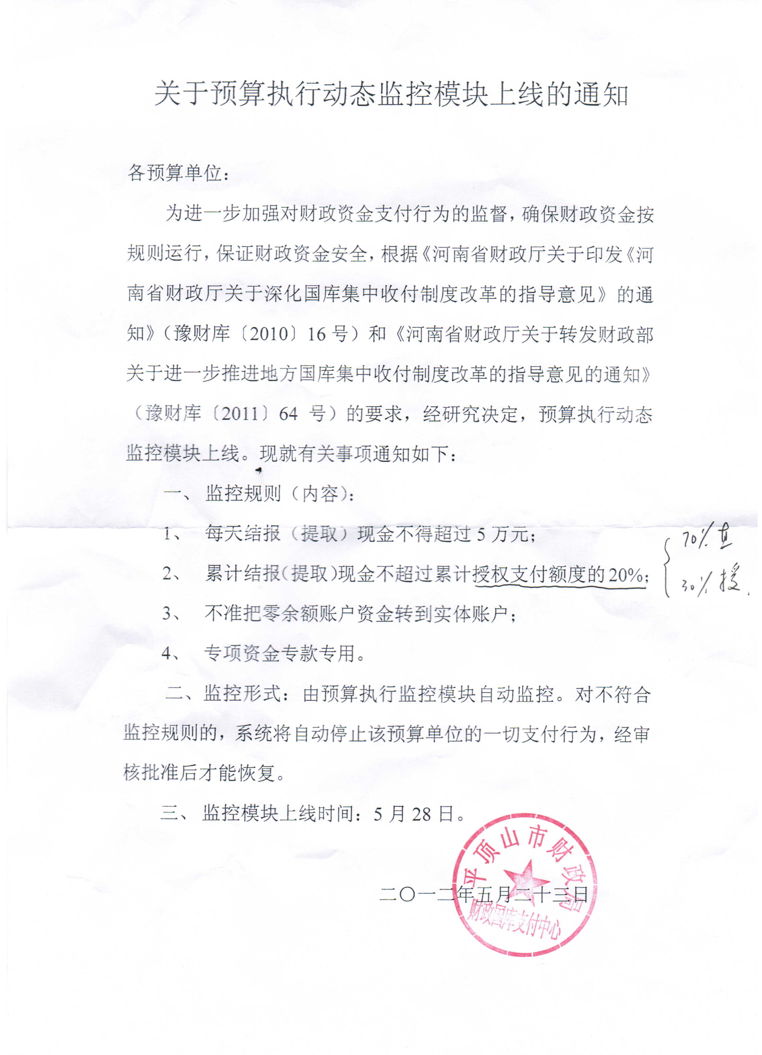 各单位: 按照平顶山市财政局财政国库支付中心《关于预算执行动态监控模块上线的通知》,自2012年5月28起,全市预算单位执行动态监控模块上线。