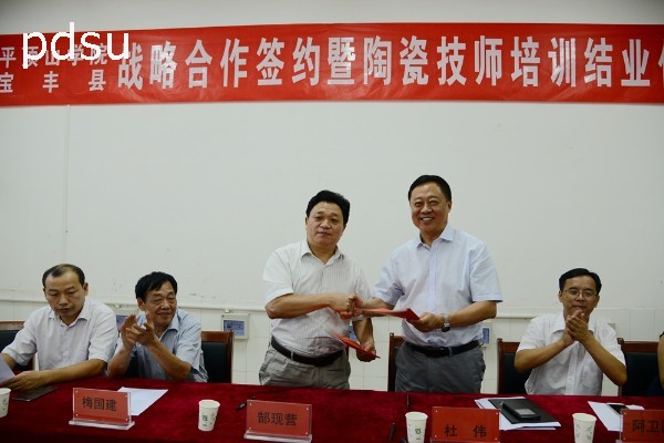 8月30日下午,平顶山学院与宝丰县人民政府战略合作签约暨宝丰县首届陶瓷企业技师培训班结业典礼在艺术楼陶瓷教室举行。